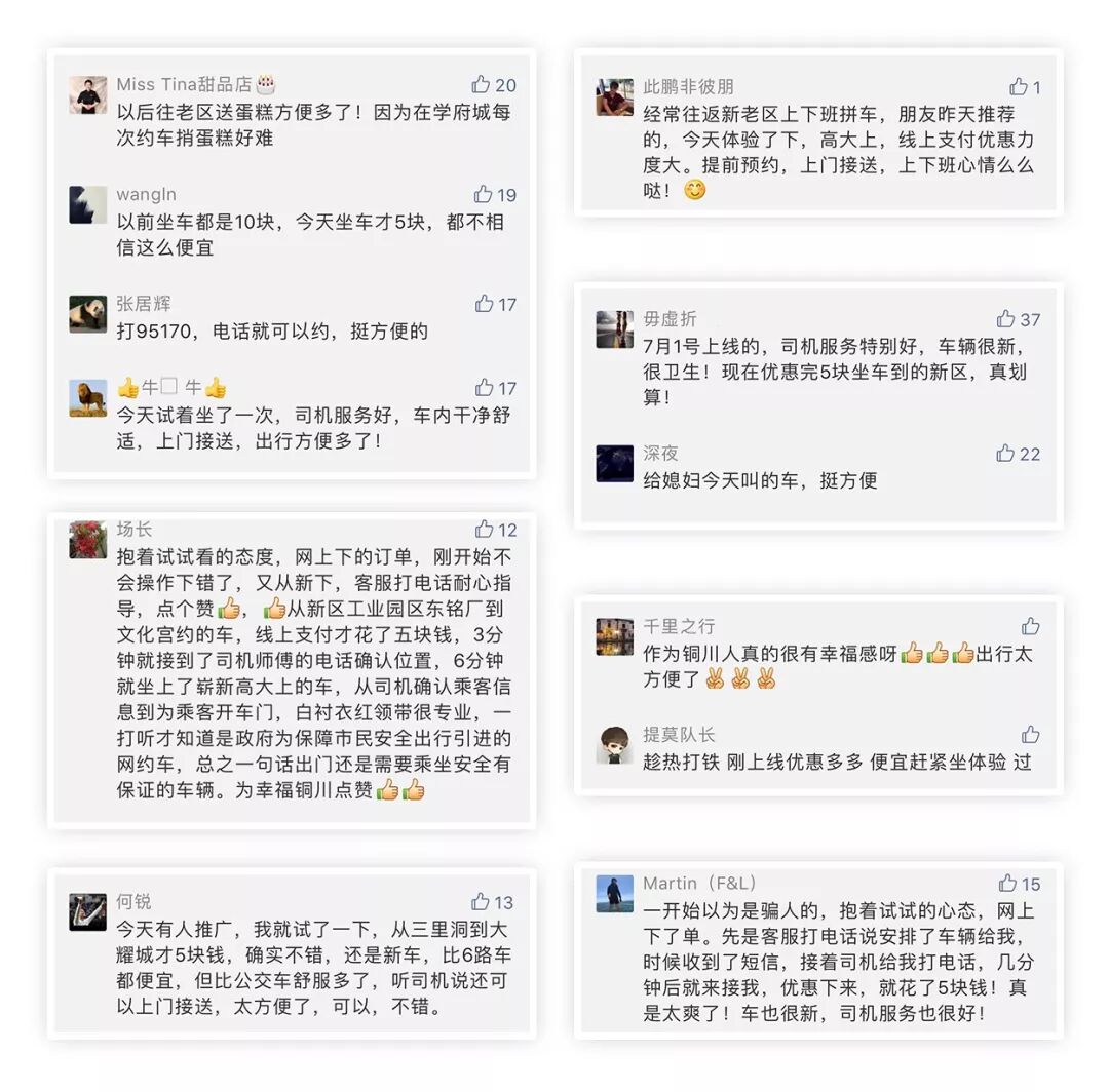体验过“铜川·帮邦行”网约出行服务的乘客纷纷表示“司机服务好”、“车辆新、车内干净”、“上门接送很方便”、“相当实惠”。